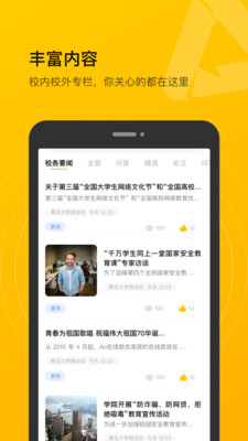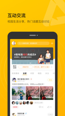 校内动态实时更新、校外热点精选推荐、热门话题互动交流、校园生活记录分享。