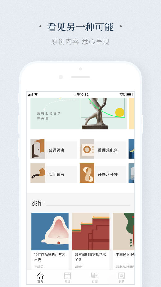 之前只能去别的app收听看理想音频,现在有自己的app了,全是看理想自己的内容,对于粉丝来讲简直不要太好,界面也是好清新的说