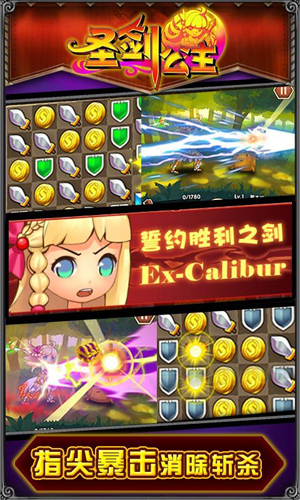 圣剑公主是一款动作即时消除手游,核心玩法为目前流行的三消玩法,不同的是在三消的基础上加入了人物战斗及成长, 释放怒气大招,换装等玩法。当角色怒气集满的时候,我们的公主就能释放传说中的Ex-Calibur了,大招一出就能一刀秒杀哦!还有众多精灵MM任你挑选,千万别看花了眼睛。让我们一起保卫王国,踏上征途吧!