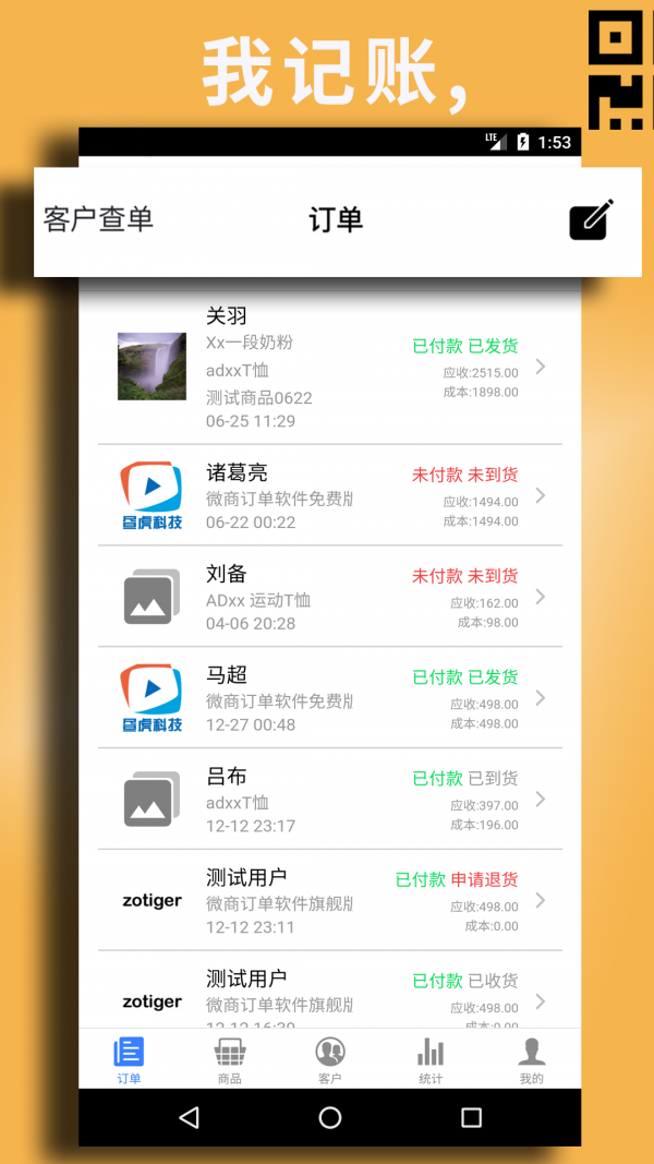 *记账、商品管理、客户管理,客户自助查单查快递...
