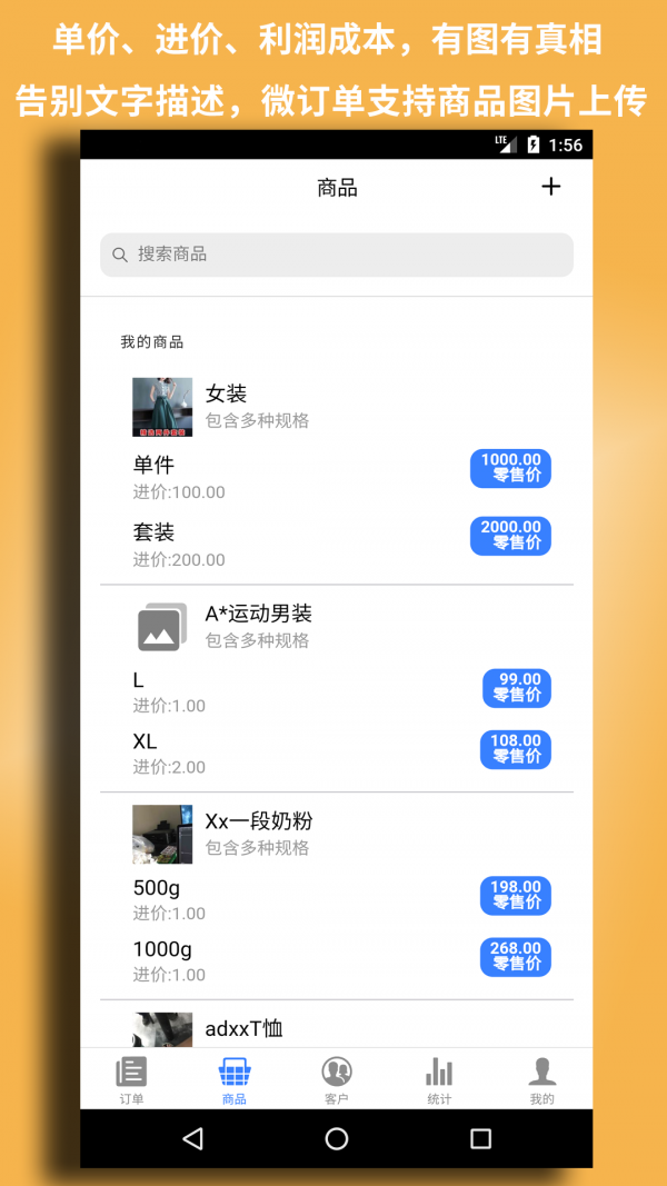 单价、进价、利润成本,有图有真相,告别文字描述,微订单支持商品图片上传。