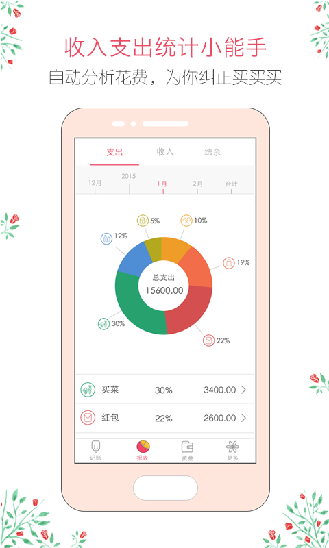 4、每月支出明细图表,收入明细图表和收支结余明细图表直观的向您展示了您每月的资金流向