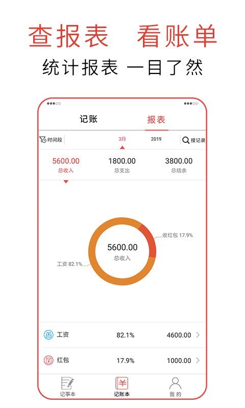 报表统计:收支统计图形化展示,账目详情列表一目了然