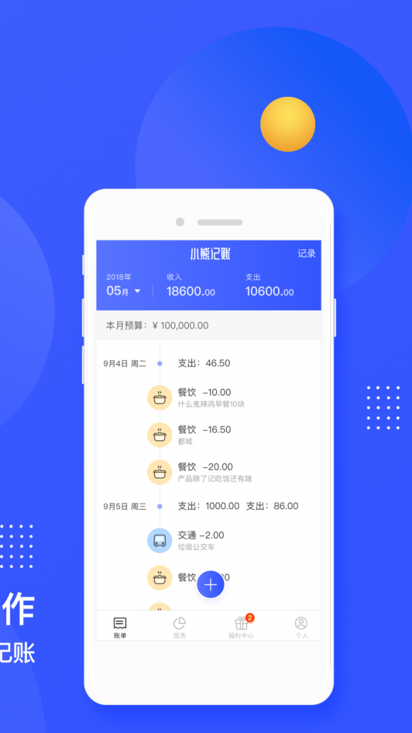 1、轻松记账,点击首页记账按钮,选择类型,输入金额即可完成一次记账!