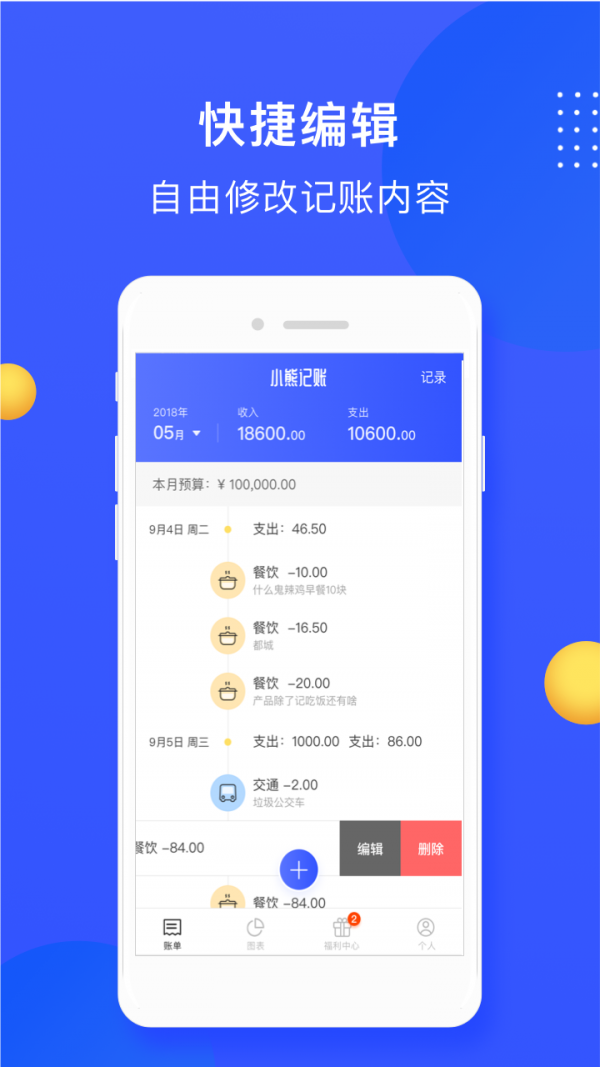 2、快捷编辑,可对之前的账单进行快捷操作,点击记账金额直接加减,零碎消费统一记录!
