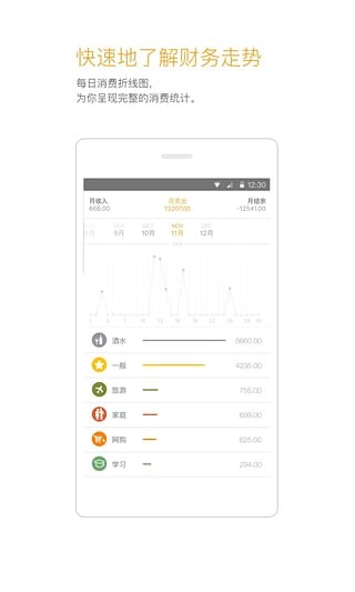 直观分析:财务的分析上,有折线图、饼图、预算控制图、非必要支出图等,几张简洁的图表,将死的账单变活了,自己的小金库一下就直观全掌握!