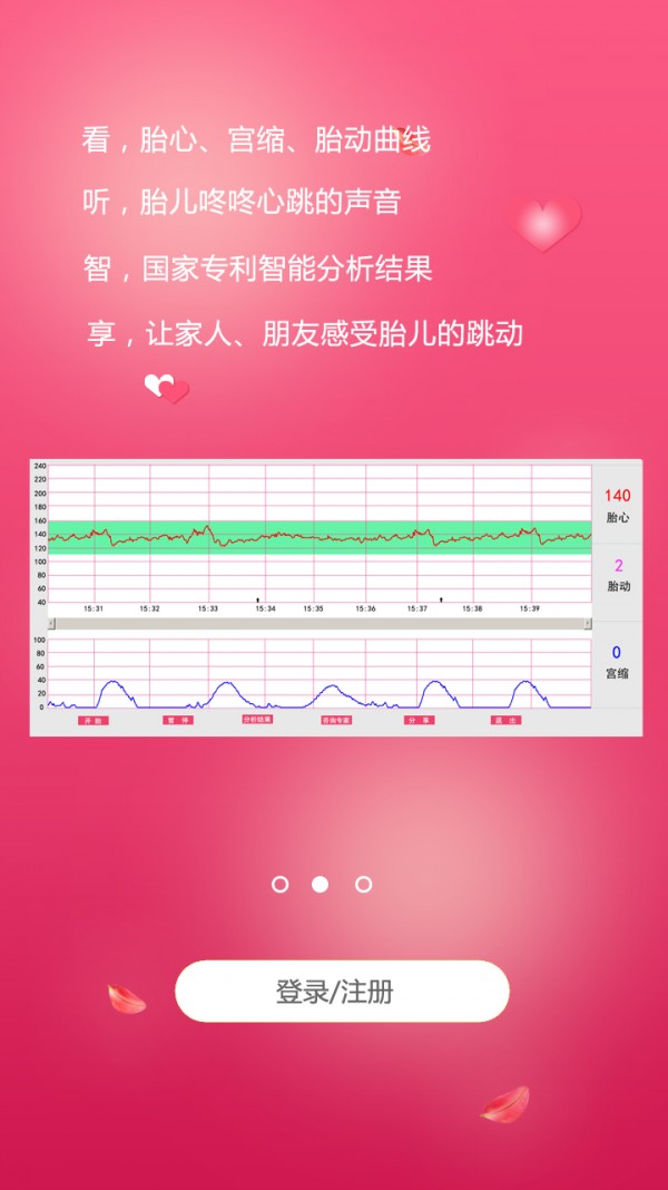 2、胎儿监护智能分析:孕妇手机显示胎儿监护曲线并进行智能分析,监护完毕自动给出监护结论及胎儿评分,让孕妇随时了解掌握胎儿情况做到安心放心!