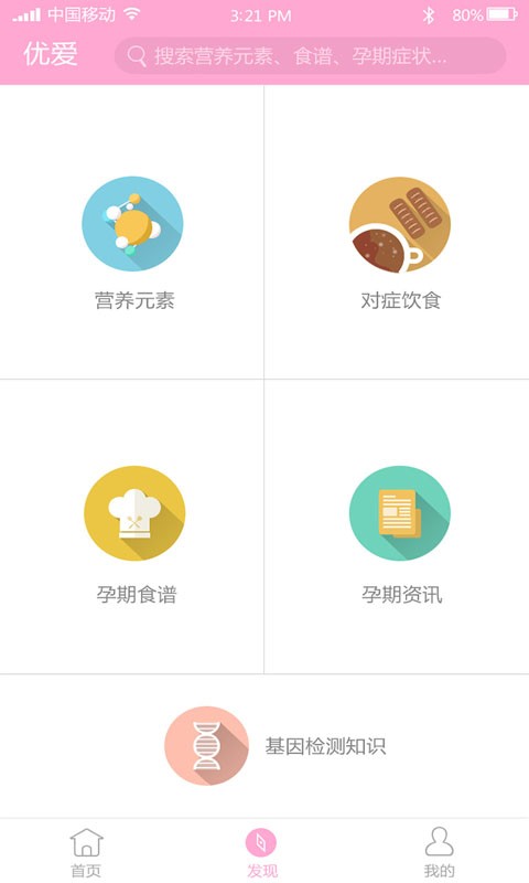 该产品是一款提供给孕妇的营养补充和孕期相关调理的软件。孕妇或者待怀孕女性等接受相关的营养吸收能力基因检测后,通过该应用可以及时查看到营养吸收能力检测报告;利用此报告,在怀孕的各阶段,即能得到专业的营养补充建议和相关的营养食谱,真正做到科学且有的放矢地调理孕妇健康状态,达到优生优育。此外,应用还提供其他孕期相关的症状处理建议、各类孕期咨询帮助等。