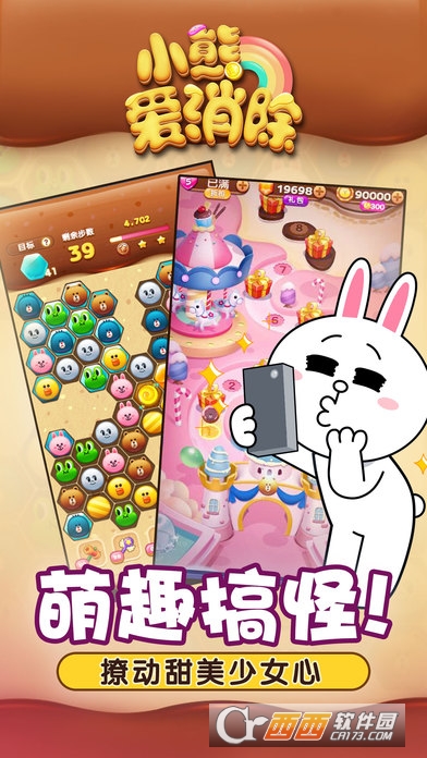 获得LINE正版授权,游戏内满是呆萌可爱的布朗熊和他的小伙伴们,俏皮的可妮兔、温暖的莎莉还有更多LINE角色聚集在《小熊爱消除》中,喜欢他们就来游戏中与他们见面吧!