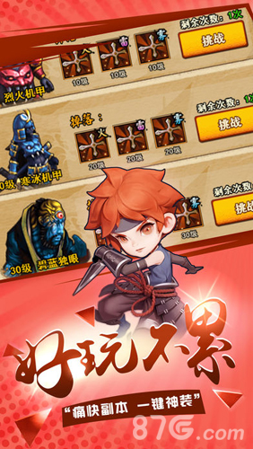 《赤影传说》是一款每日轻松挂机就能瞬间超神的上班放置类手游!忍者乱斗,不费心思不耗神,放置挂机,畅爽升级体验,福利七天,金币修为丹不断,极品神器登录送,花样外观,玩转次元穿越。极品通灵,召唤九尾,极品装备自由掉落,挂机刷Boss也能称霸全服。创建工会,邀请好友一起组队打副本,一起畅玩。忍者结印,术法天下,极品瞳术破灭虚妄,赶紧来玩吧!