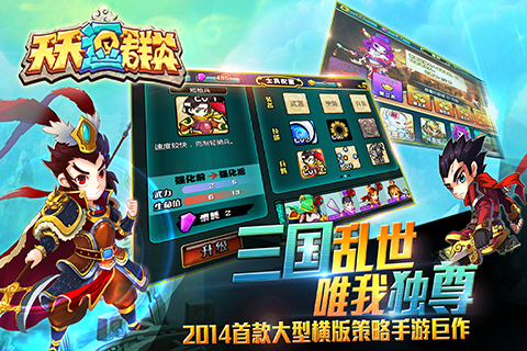 《天天逗群英》是一款新型的群战策略卡牌手机游戏,以武将带领百人军队进行群斗的群战模式为核心;战斗过程斗智斗勇,指挥士兵和武将前进、冲锋,用军令和武将技相互配合,在100VS100的大场面战斗中尽显名将风采。面对敌人的千军万马,用群杀技能全屏杀敌;如暴雨般的“青涛箭雨”、赤焰冲天的“集火柱”、地崩山摧的“天崩”,绚丽特效全屏集火!