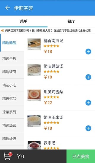 e点餐app是一款在线预约点餐应用,由宁夏中合信通科技有限公司出品,用户在手机上就可以轻松完成选择餐厅,预约点餐、支付等操作,让就餐更加方便快捷。