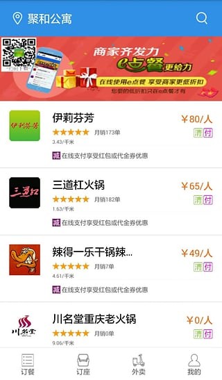 用户在就餐前可以提前选择餐厅,完成预约、点菜、支付,享受不用排队等号,到店就能享受定制美食的服务;商家可通过e点餐平台发布自己的菜单、桌位、优惠活动,合理配置商家资源,更高效地开店。