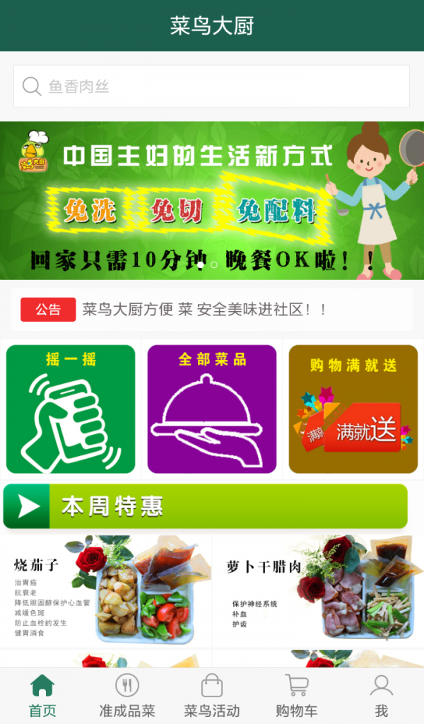 菜鸟大厨app是一款做菜应用,提供准成品菜,不用洗不用切,也无需配料,只需10分钟,就能轻松做出美味饭菜,打造中国主妇的生活新方式。