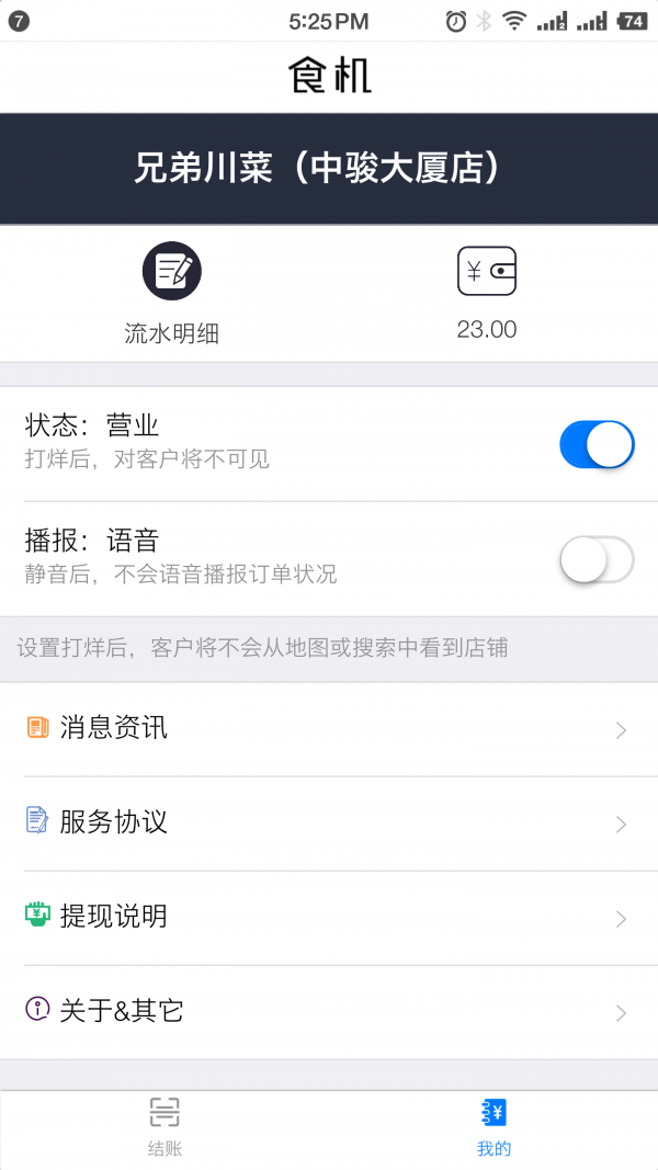 食机商家端,为饭店餐厅等商户所使用。用于收款、查账、提现和店铺管理等商家操作。用户可以通过商家出示的二维码或输入的付款码进行付款。一改往日复杂的找零过程。