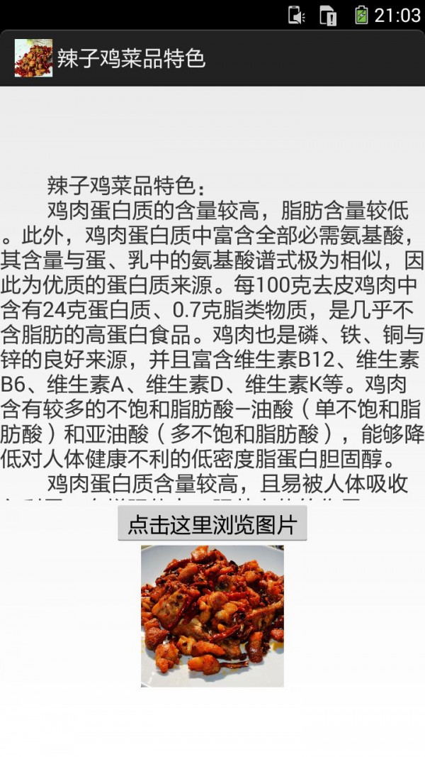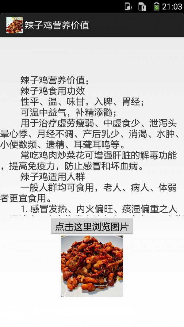 《辣子鸡的做法图文》APP手机应用内容介绍:你可以通过手机应用查阅辣子鸡做法、辣子鸡营养价值、辣子鸡菜品特色、辣子鸡菜谱小贴士、辣子鸡健康功效。辣子鸡营养价值:辣子鸡食用功效性平、温、味甘,入脾、胃经;可温中益气,补精添髓;用于治疗虚劳瘦弱、中虚食少、泄泻头晕心悸、月经不调、产后乳少、消渴、水肿、小便数频、遗精、耳聋耳鸣等。常吃鸡肉炒菜花可增强肝脏的解毒功能,提高免疫力,防止感冒和坏血病。辣子鸡适用人群一般人群均可食用,老人、病人、体弱者更宜食用。1.感冒发热、内火偏旺、痰湿偏重之人、肥胖症、患有热毒疖肿之人、高血压、血脂偏高、胆囊炎、胆石症的人忌食;2.鸡肉性温,助火,肝阳上亢及口腔糜烂、皮肤疖肿、大便秘结者不宜食用;3.动脉硬化、冠心病和高血脂患者忌饮鸡汤;感冒伴有头痛、乏力、发热的人忌食鸡肉,鸡汤......