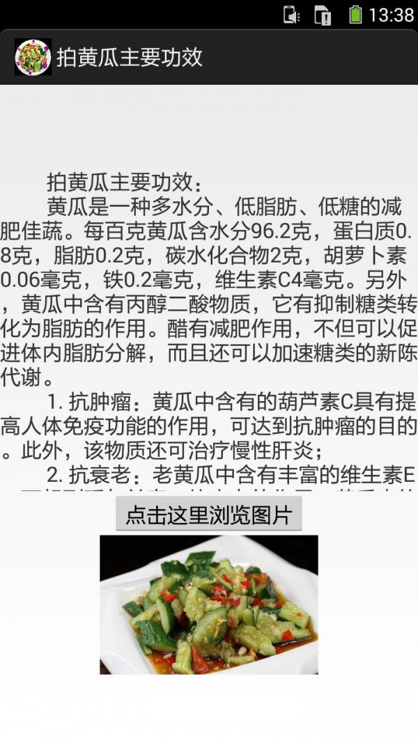 《拍黄瓜的做法图文》APP手机应用内容介绍:你可以通过手机应用查阅拍黄瓜制作方法、拍黄瓜主要功效。拍黄瓜主要功效:黄瓜是一种多水分、低脂肪、低糖的减肥佳蔬。每百克黄瓜含水分96.2克,蛋白质0.8克,脂肪0.2克,碳水化合物2克,胡萝卜素0.06毫克,铁0.2毫克,维生素C4毫克。另外,黄瓜中含有丙醇二酸物质,它有抑制糖类转化为脂肪的作用。醋有减肥作用,不但可以促进体内脂肪分解,而且还可以加速糖类的新陈代谢。1.抗肿瘤:黄瓜中含有的葫芦素C具有提高人体免疫功能的作用,可达到抗肿瘤的目的。此外,该物质还可治疗慢性肝炎;2.抗衰老:老黄瓜中含有丰富的维生素E,可起到延年益寿、抗衰老的作用;黄瓜中的黄瓜酶,有很强的生物活性,能有效地促进机体的新陈代谢。用黄瓜捣汁涂擦皮肤,有润肤,舒展皱纹的功效;3.防酒精中毒:黄瓜中所含的丙氨酸、精氨酸和谷胺酰胺对肝脏病人,特别是对酒精肝硬化患者有一定辅助治疗作用,可防酒精中毒;4.降血糖:黄瓜中所含的葡萄糖甙、果糖等不参与通常的糖代谢,故糖尿病人及黄瓜代替淀粉类食物充饥,血糖非...