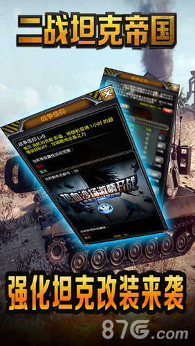 二战坦克帝国是一款以战争为题材打造的现代坦克战争游戏,玩家在《二战坦克帝国》内,扮演着一名指挥官。在一场战争后,玩家带领着残余的部队,在一座偏僻遗弃基地,开启了征战与建设发展的新篇章。游戏内含六大特色系统,操作简单、画面美观、玩法丰富。在游戏中,玩家采集资源、升级建筑、研发科技、建造坦克。逐步地壮大自己的实力,并与其他玩家争夺资源,或者组成公会一起对抗强大的敌人。