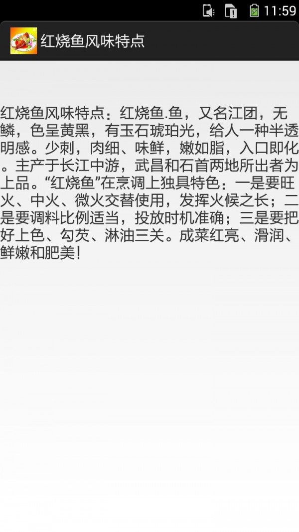 红烧鱼APP手机应用内容介绍:你可以通过手机应用查阅到红烧鱼风味特点、红烧鱼相关传说、红烧鱼做法。红烧鱼相关传说:传说鱼原是天上监管鱼族的神灵,因同情神鱼私自下凡,被玉皇大帝压在武昌黄鹤楼下的长江中,以巨石镇之,以化石为食。不知经过了多少年,有一天,黄鹤翩翩戏掠江面,听得江中有呼救之声,黄鹤随声潜......