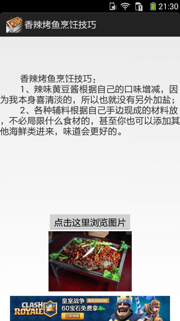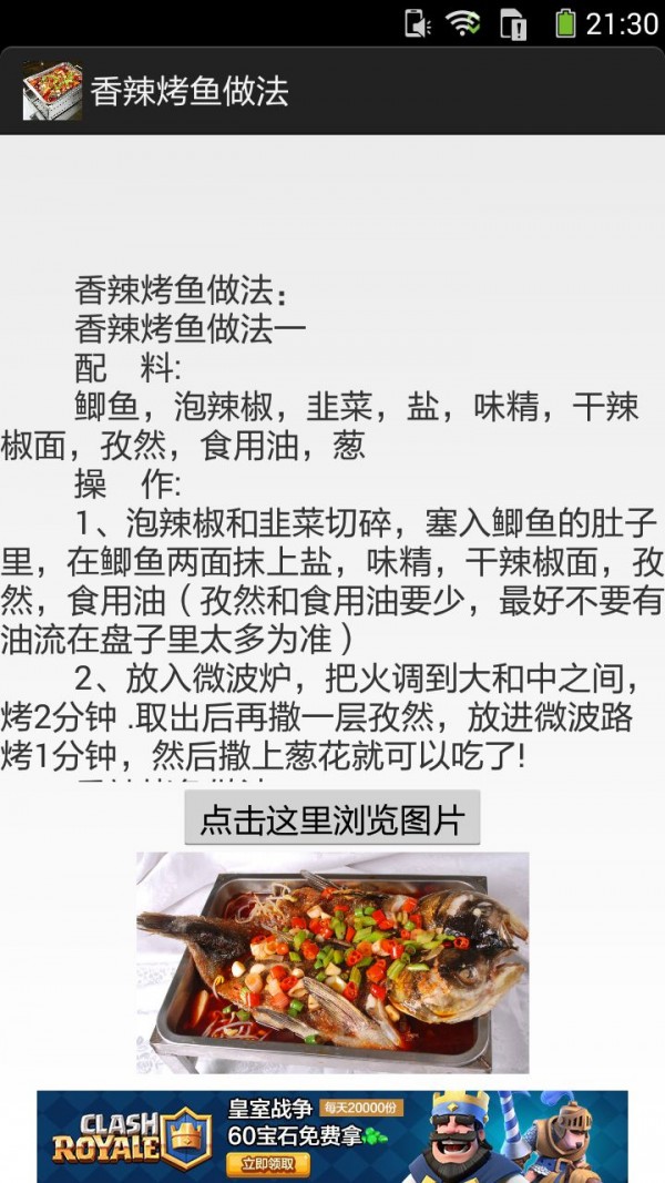《香辣烤鱼的做法图文》APP手机应用内容介绍:你可以通过手机应用查阅香辣烤鱼菜品特色、香辣烤鱼做法、香辣烤鱼烹饪技巧。香辣烤鱼做法:香辣烤鱼做法一配料:鲫鱼,泡辣椒,韭菜,盐,味精,干辣椒面,孜然,食用油,葱香辣烤鱼操作:1、泡辣椒和韭菜切碎,塞入鲫鱼的肚子里,在鲫鱼两面抹上盐,味精,干辣椒面,孜然,食用油(孜然和食用油要少,最好不要有油流在盘子里太多为准)2、放入微波炉,把火调到大和中之间,烤2分钟.取出后再撒一层孜然,放进微波路烤1分钟,然后撒上葱花就可以吃了!香辣烤鱼做法二材料:黑鱼1条(鲤鱼、草鱼、鲶鱼等其它鱼也可以,约1.5斤)、香芹菜50克、土豆1个、魔芋豆腐1块、姜20克、大蒜100克、干辣椒100克、花椒15克、郫县豆瓣2大匙(30ml)、酱油1大匙(15ml)、盐适量、糖1茶匙(5克)、鸡精少许、鲜汤250ml、油腌鱼调料:葱、姜片、盐、料酒、辣椒面、花椒面、孜然粉、酱油、油。1、将黑鱼洗净,剪去鱼鳍,然后沿鱼骨将鱼部分分开,使鱼分成两半,鱼背相连。再用葱段、姜片、1勺(5ml)料酒和...