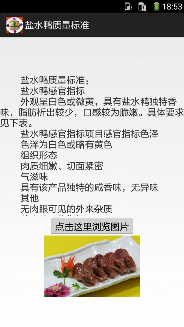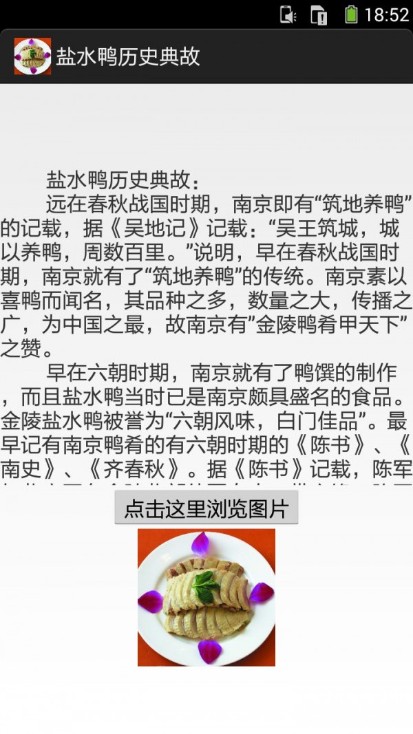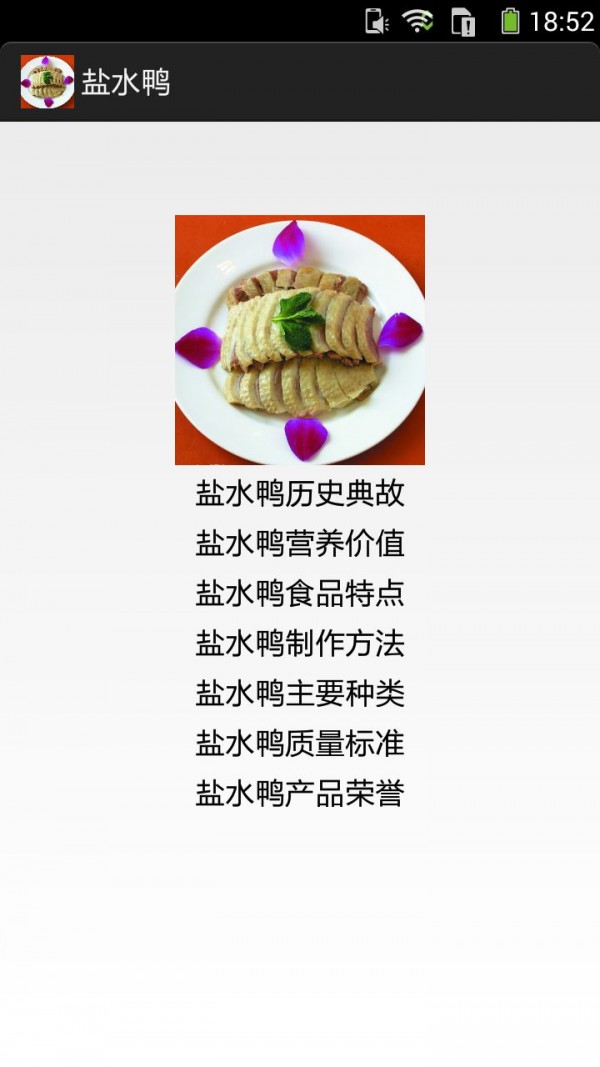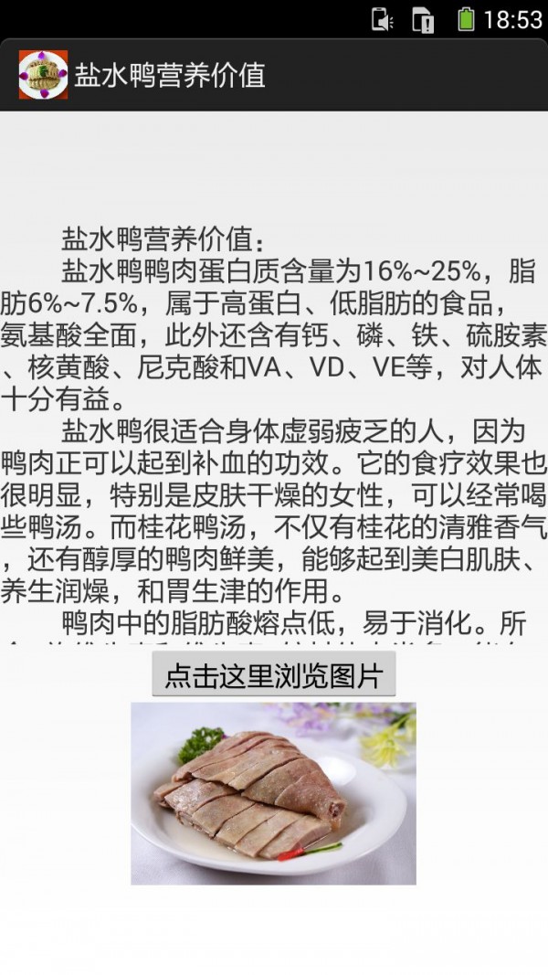 《盐水鸭的做法图文》APP手机应用内容介绍:你可以通过手机应用查阅盐水鸭历史典故、盐水鸭营养价值、盐水鸭食品特点、盐水鸭制作方法、盐水鸭主要种类、盐水鸭质量标准、盐水鸭产品荣誉。盐水鸭营养价值:桂花鸭盐水鸭鸭肉蛋白质含量为16%~25%,脂肪6%~7.5%,属于高蛋白、低脂肪的食品,氨基酸全面,此外还含有钙、磷、铁、硫胺素、核黄酸、尼克酸和VA、VD、VE等,对人体十分有益。盐水鸭很适合身体虚弱疲乏的人,因为鸭肉正可以起到补血的功效。它的食疗效果也很明显,特别是皮肤干燥的女性,可以经常喝些鸭汤。而桂花鸭汤,不仅有桂花的清雅香气,还有醇厚的鸭肉鲜美,能够起到美白肌肤、养生润燥,和胃生津的作用。鸭肉中的脂肪酸熔点低,易于消化。所含B族维生素和维生素E较其他肉类多,能有效抵抗脚气病,神经炎和多种炎症,还能抗衰老。另外,鸭肉中含有较为丰富的烟酸,它是构成人体内两种重要辅酶的成分之一,对心肌梗死等心脏疾病患者有保护作用。鸭肉性寒凉,性寒,味甘,咸,主大补虚劳。滋五脏之阴,清虚劳之热,补血行水,养胃生津,止咳自惊,消螺...