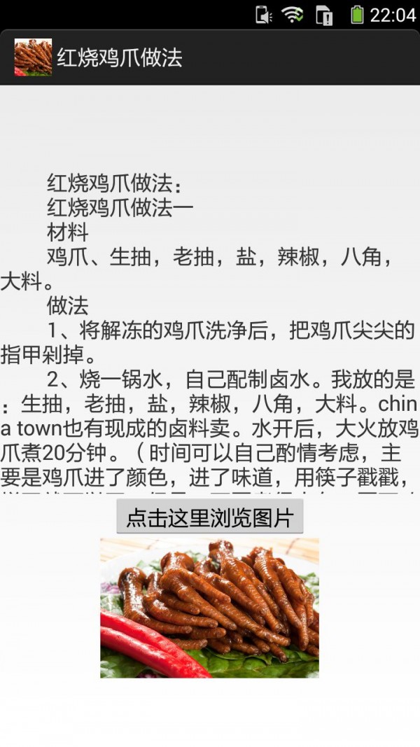 《红烧鸡爪的做法图文》APP手机应用内容介绍:你可以通过手机应用查阅红烧鸡爪菜品特色、红烧鸡爪做法。红烧鸡爪做法:红烧鸡爪做法一材料鸡爪、生抽,老抽,盐,辣椒,八角,大料。做法1、将解冻的鸡爪洗净后,把鸡爪尖尖的指甲剁掉。2、烧一锅水,自己配制卤水。我放的是:生抽,老抽,盐,辣椒,八角,大料。chinatown也有现成的卤料卖。水开后,大火放鸡爪煮20分钟。(时间可以自己酌情考虑,主要是鸡爪进了颜色,进了味道,用筷子戳戳,烂了就可以了。但是,不要煮得太久,要不鸡爪就没有嚼劲了。)3、然后把炒锅烧热,放油,葱蒜,准备下锅了。我还放了点糖在油里融化了。炒得时候加点料酒最好。4、最后放点配料,味精之类的,出锅!红烧鸡爪做法二材料鸡爪,姜片,蒜瓣,八角,干辣椒段,小葱白,葱绿,生抽,老抽,盐,糖,油。做法1.鸡爪剪去指甲洗净,入锅中穿烫一下,沥出备用。2.姜片、蒜瓣、八角、干辣椒段、葱白、葱绿准备好。3.热锅入油,油稍热加入姜片、蒜瓣、八角爆香,转中火加入干辣椒段及鸡爪炒一炒。(这里要小心啊,鸡爪皮容易爆的,别烫到...