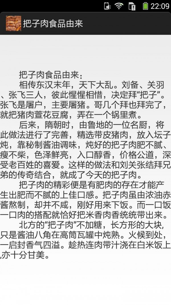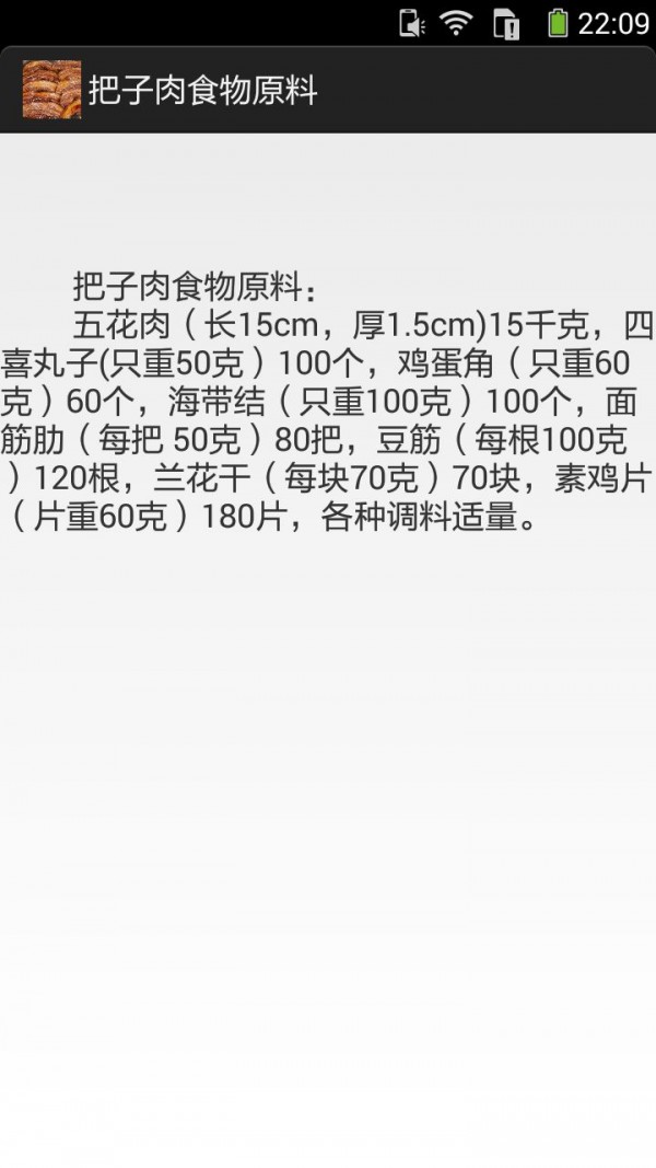 《把子肉的做法图文》APP手机应用内容介绍:你可以通过手机应用查阅把子肉食品由来、把子肉食物原料、把子肉常见做法、把子肉食物特点。把子肉食物原料:五花肉(长15cm,厚1.5cm)15千克,四喜丸子(只重50克)100个,鸡蛋角(只重60克)60个,海带结(只重100克)100个,面筋肋(每把50克)80把,豆筋(每根100克)120根,兰花干(每块70克)70块,素鸡片(片重60克)180片,各种调料适量......