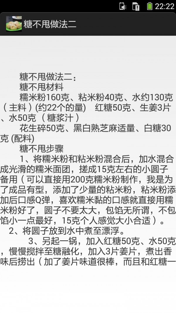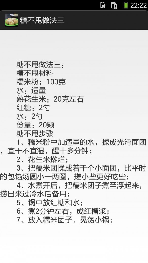 《糖不甩的做法图文》APP手机应用内容介绍:你可以通过手机应用查阅糖不甩由来典故、糖不甩趣事、糖不甩做法一、糖不甩做法二、糖不甩做法三、糖不甩做法四。糖不甩趣事:相传“糖不甩”还跟男女姻缘相关呢。地处东坑、茶山、横沥各镇的“埔田片”一带,旧时男婚女嫁还比较保守,更谈不上如今的自由恋爱了。每当媒婆带后生仔到女家“相睇”,如果女方家长同意这门亲事,便煮“糖不甩”招呼男方。男方看到端上桌上的是“糖不甩”,知道这门亲事“甩”不了了,于是大功告成,大碗“糖不甩”越吃越香,吃完一碗再添一碗,表明愿意好事成双。如果女方不同意这门亲事,则煮打散鸡蛋的腐竹糖水,男方看到台上摆的是碗打散鸡蛋的腐竹糖水,知道这门亲事“散”了,那就知趣一点,以后别再纠缠了,这时“腐竹糖水”虽甜在嘴巴,却苦在心上,匆匆喝上一口,便告辞而去。这样的事,对上年纪的东坑人来说,都非常清楚。有关“糖不甩”的趣事尚多。据传公元1883年,即光绪九年,慈禧终止听政,光绪帝亲政皇朝。广开贤路,恢复全国科举大考。东坑丁屋村贫苦才子丁仁长,上京赴考,沿途以吃母亲所做...