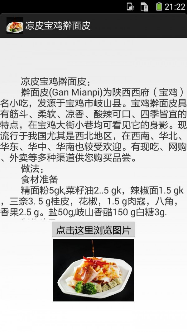《凉皮的做法图文》APP手机应用内容介绍:你可以通过手机应用查阅凉皮营养价值、凉皮制作方法、凉皮宝鸡擀面皮、凉皮秦镇米皮、凉皮岐山擀面皮、凉皮麻酱凉皮、凉皮口味、凉皮凉皮吃法、凉皮制作方法:1、在面粉里加少量盐,和成面团,盖上湿布醒30分钟左右2、将上述所得面团放在一大容器里,加适量水,开始洗面筋,在水中不停的揉捏面团,待容器里的清水混稠时,将其用滤网滤到另外的容器里3、重复重复再重复,直到水不再浑浊,剩下那一下块黄黄的东东就面筋啦,在面筋里加点发酵粉抓匀,上蒸屉,足气蒸20分钟,晾凉后切片(PS:也可以不蒸,用油炸下,然后炒着吃,味道也不错)4、然后就是所得面糊啦,让其静置分层,一般至少要沉淀3小时,偶是头天晚上洗好,第二天才蒸的,面糊沉淀的时间越长,做出的凉皮儿越筋道5、沉淀完成后,把上面的清水倒掉,用勺子把下面的沉淀搅匀,就可以蒸了。6、锅上火入水,待水沸,往模型(有专门蒸凉皮的模子,偶用的是曲奇饼干的盒盖,效果还可以)里刷少许油,舀一勺面糊倒入,面糊的多少由个人掌握,喜欢厚一点儿的凉皮儿就多舀一...