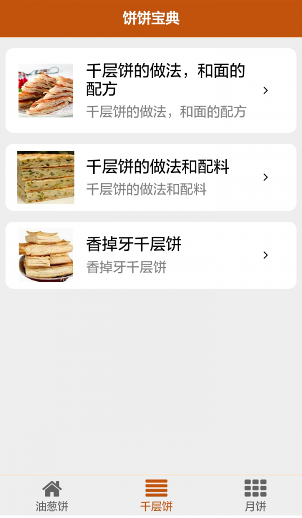 饼饼宝典,包含千层饼,葱油饼,月饼等多式多样的做法及做饼的时候需要注意哪些技巧,帮助初学者轻松快速的学会饼的做法。