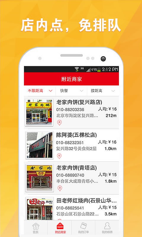 查找:地图列表双重模式,搜罗身边特惠美食并且提供商户的电话和地址;