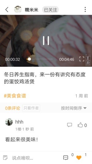 发布美食视频动态,发布动态的时候,选择视频即可,30秒以内的短时间优先通过审核。