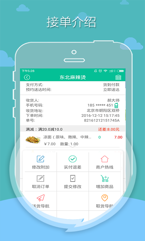 当前版本实现了送餐,取餐,地图导航,金额结算等功能呢个。还新加入了帮助商家开户的特殊功能。