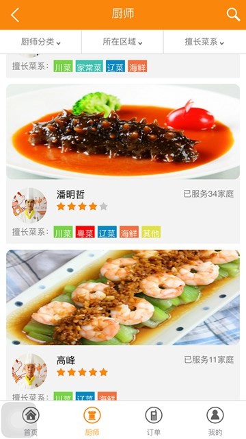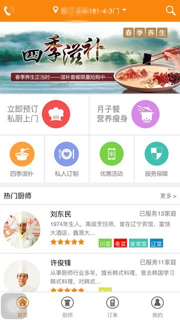 预约私厨:打开首页即可预约厨师,根据厨师风采、擅长菜系选择厨师
