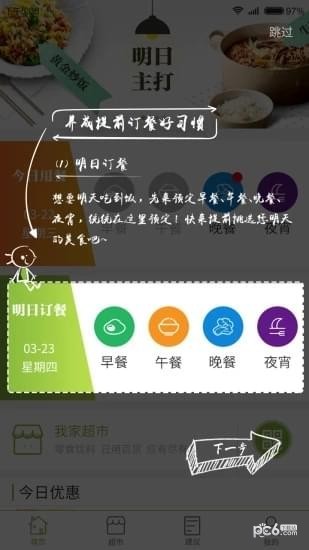 app是一款解决企业员工就餐问题的客户端应用,在手机版上根据自己喜欢预定明日菜谱,提前享受优惠折扣,便宜新鲜省钱,并且有效降低食物浪费率。