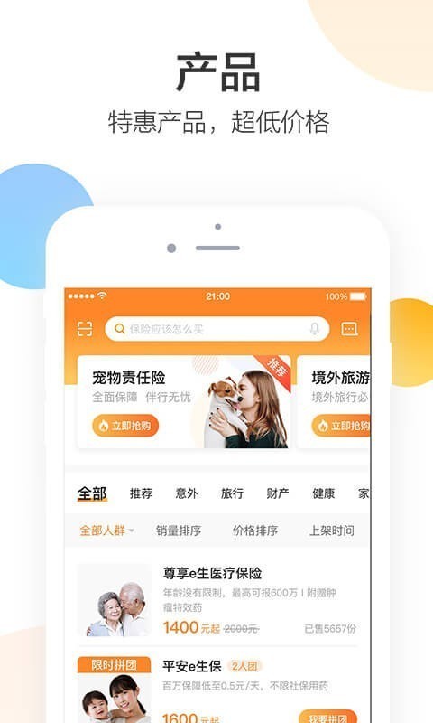 【保险购买】用户可以在首页、产品菜单栏中选择优质的保险产品购买,也可以领取免费的保险,并且在第一次注册时可以领取到保险折扣券。