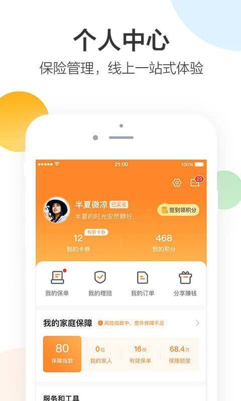 5、个人中心:一站式保单管理、自助理赔等线上保险服务功能。