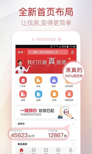 打开App,清新的界面映入眼帘,App的首页“100%真房源”的蓝色Banner相当显目,App没有采用目前流行的侧边栏功能栏的样式,而是保留了首页功能导航键最直白的展现方式,这种样式的设定最大的优势就是便于用户索引,进而快速找到自己想使用的功能。首页的界面上的“新房”、“二手房”等功能直接在用户眼前呈现,相对来说更加快捷。小编认为整体而言,App的这种功能设定键的方式保留了传统的原汁原味,经典而又实用。