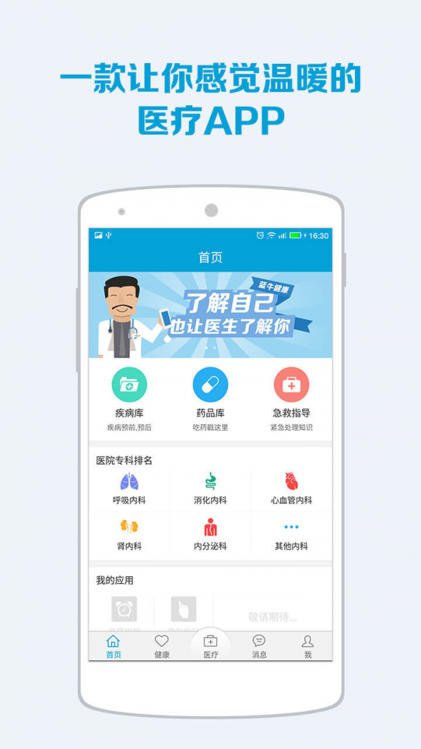 蓝牛健康是一款让你感觉温暖的医疗APP,通过患者对个人以及家庭的医疗健康档案的在线管理,实现医院在院后、诊后对患者提供医疗关怀和患者院后康复情况追踪,通过专业的注意事项,智能提醒,随访问卷等帮助患者在家安心养病。