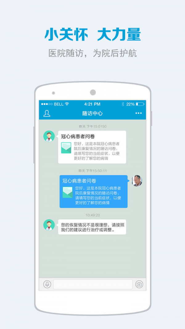 本版本新增小视频,危机值提醒功能,从而实现更好的医患沟通, 和患者健康管理功能。 实现患者对个人以及家庭的医疗健康档案的在线管理,实现医院在院后、诊后对患者提供医疗关怀和患者院后康复情况追踪,通过专业的注意事项,智能提醒,随访问卷等帮助患者在家安心养病。