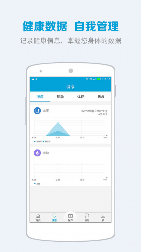 -----个人健康记录管理:实现个人健康的管理,包括体温、心率、血糖、血压的管理,更方便的关注自己的健康。
