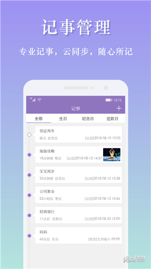 4. 记事提醒:拥有完善的提醒功能,操作简单快捷,包含笔记提醒、生日提醒、纪念日提醒、还款日提醒等,可以方便管理安排生活中的细节小事,随时随地提醒重要事项,让生活变得井井有条;