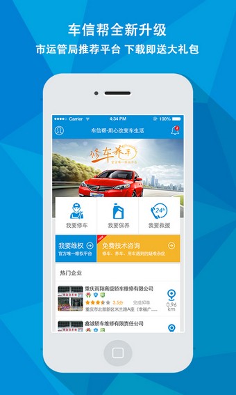 车信帮app是一款智能养车应用。车信帮app能让你轻松知道爱车的状况,随时查看附近维修保养点,让您养车更省心。