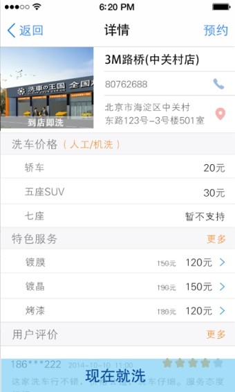 车主用户可通过“美车吧”手机应用客户端,或“智慧美车”微信认证公众服务号使用美车吧平台的服务。在“美车吧”服务平台上,车主用户可根据自身当前位置快捷的查询到附近的美车吧合作洗车行,并根据各合作商户所处位置、价格、营业状态等选择自己中意的洗车行,预约或直接前往接受服务,更可享受平台内支付的快捷便利。