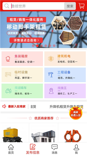 鲁班世界app是建设租赁领域的信息发布平台,提供发布找技工服务,及集装箱房、建筑机电、临时设施、工程设备、找运输车等租售信息发布和在线交易,并开创了线上交易和信息服务的全新模式,让建筑业更轻松!