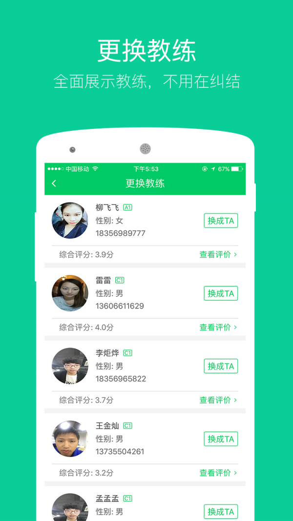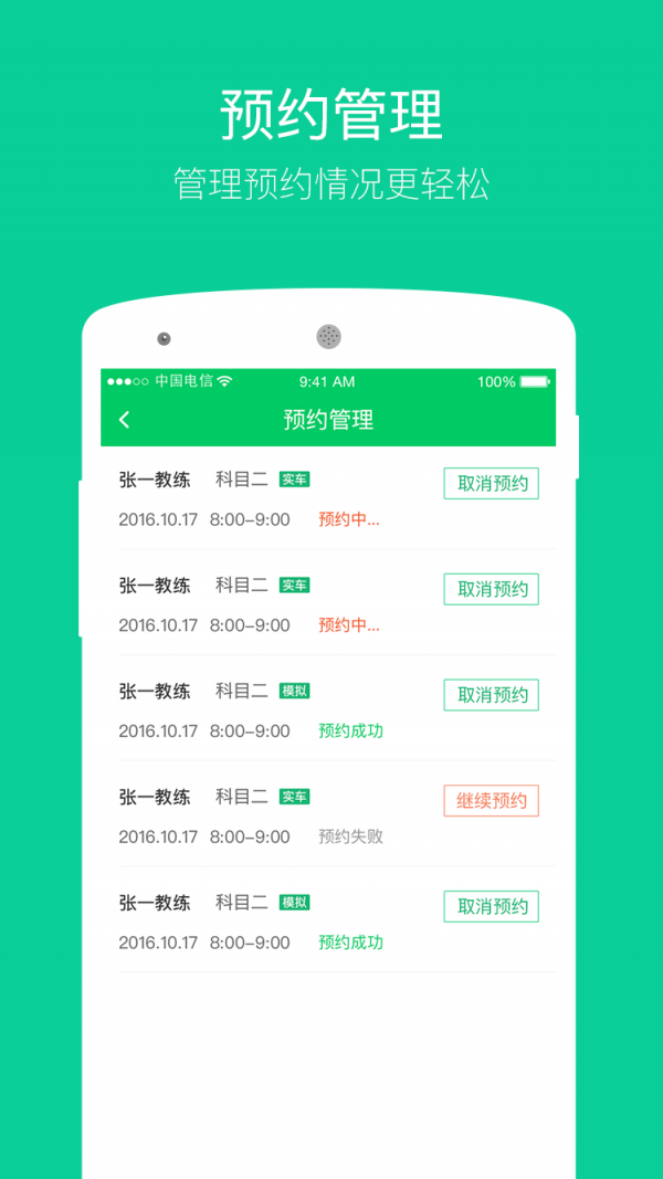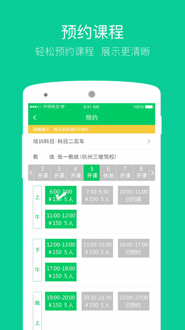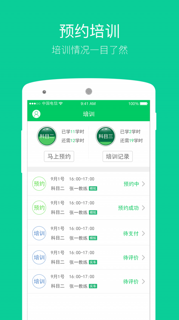 随时预约:随时随地预约练车,自由选择教练,合理安排练车时间,解除排队等待的忧伤。