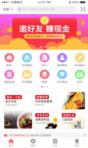 app一款基于位置服务的前提下深入社区实体店的APP,app整合不同的实体商家,围绕不同场景满足消费者个性化需求,实现平台与商家、商家与用户之间的多元化互动,构建一个商品流、信息流、利润流全融合的线上APP。目前已经开通深圳、成都、惠州、宜昌、北京等城市。