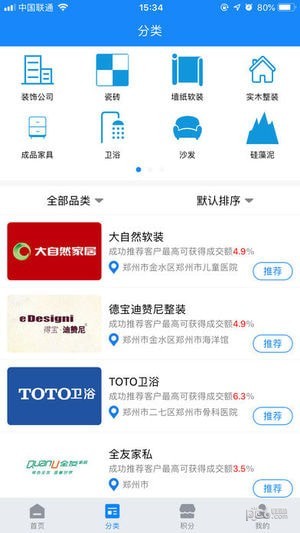 app将建材家居行业内商家分类,会员可根据品类来快速查找相应商家信息。