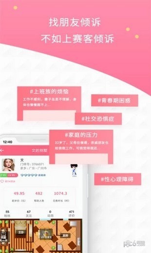 用户还可以在赛客找到你所希望的角色扮演者,通过完成各种日常事务,进行真人测试,认清自己的各种困扰的真实来源,从不同的角度观察体会后领悟解决问题的方案。