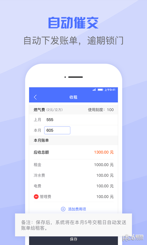 4、自动催缴:每月租金账单自动送达,无需上门催缴,房东可通过随时查看交租状态。